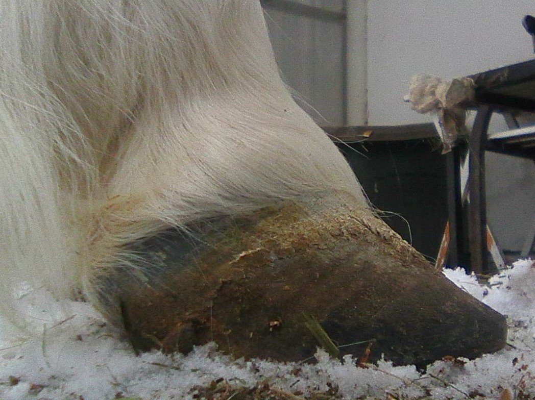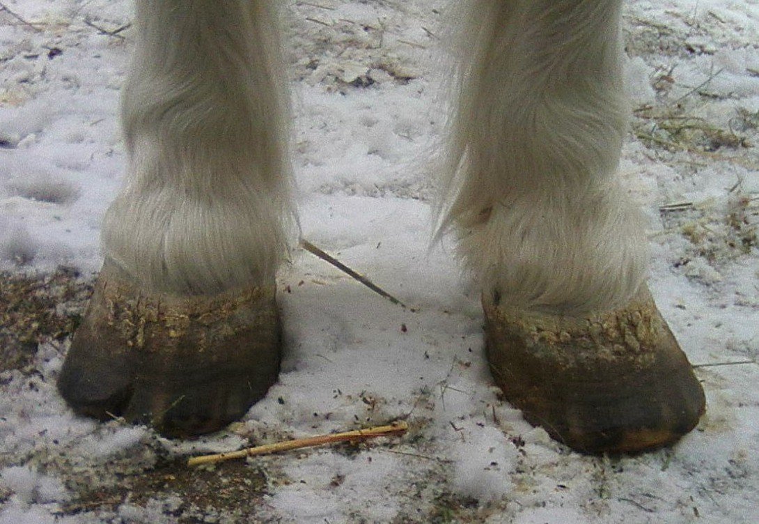 Pavlina: Tak o zimní laminitidě slyším poprvé. Je pravda, že kulhat začla jak se koncem listopadu ochladilo a napadl sníh a zhošila se koncem roku jak začalo mrznout. Jinak jsem to dnesk nevydržela a nasypala půl pytlíku fenylbutazonu, ale přijde mi, že to tentokrát zabírá nějak divně. Po týdnu braní NSAID je na tom mnohem hůř než předtím. Rotace tam určitě nějaká bude a nejspíš i pokles. Rentgeny mám bohužel jen staré, loni se auktně řešily šlachy. Ale určitě plánuji nové zjara, pokud se mi podaří uhnat veterináře. Kovář jezdí jednou za půl roku, v mezičase upravuji sama cca po 1-2 týdnech. Kopyta má rozpadlá, bílá čára se roztáhla na cca 2cm, na jedné noze částečně odumřela a kopyto prasklo. Ale dle kopytářky bylo vše na dobré cestě a čekalo se až to odroste. Mě na tom mate to, že už vše bylo v pohodě, kobyla chodila čistě i bosá po asfaltu, krmím stále stejně a najednou opět lehne.