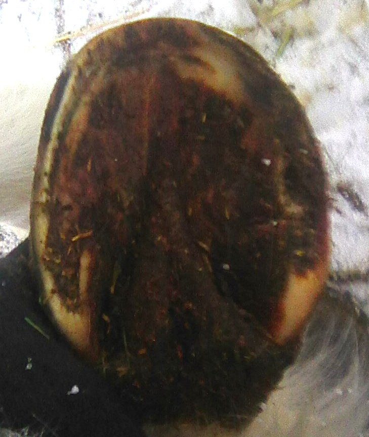 Jsem z Liberecka, pokud doporučíte ochotného veta s rentgenem, případně dobrého kopytáře, budu vděčná. Já se snažila sehnat kopytáře 3/4 roku a ti co jsem kontaktovala mě odmítli, že nové zákazníky neberou, ačkoliv jsem nabízela, že zaplatím cokoliv si řeknou. Vím že tvar kopyt není ideální a snažím se to řešit, ale jako laik toho moc nezmůžu. Přidávám dnešní fotky kopyt zespodu, ale moc tam toho asi nebude vidět. První fotka: pp, druhá fotka je pro porovnání jak pravé kopyto vypadalo loni v srpnu.
