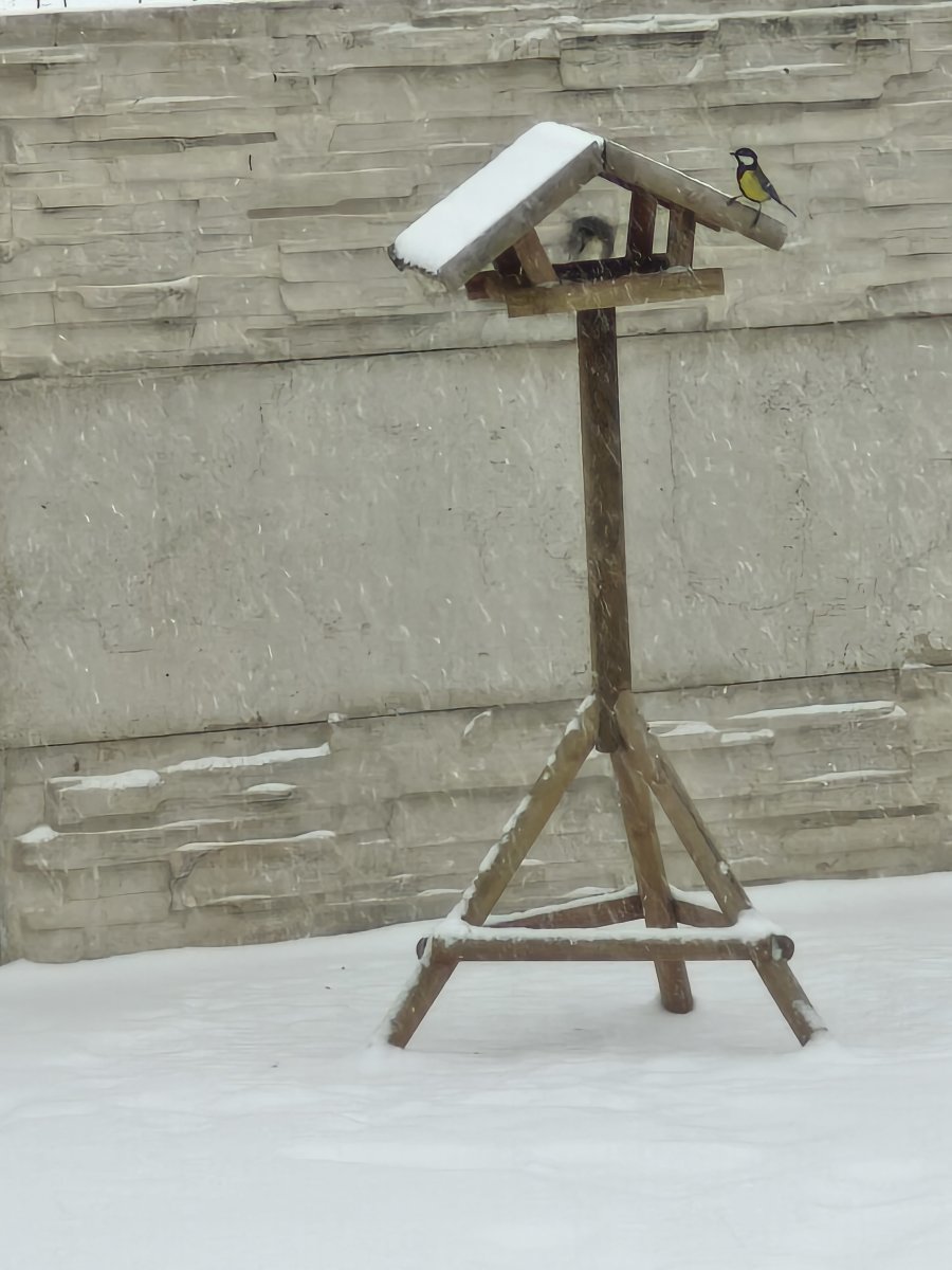 tak díky sněhové pokrývce se nám skokem zvýšila spotřeba všeho (směska zrní, slunečnice, lojové koule, půlená jablíčka, vlašáky sekané…). Jen paní krahujcová si nevybrala z jídelního lístku, ale samoobsloužila se nepozorným kosákem…