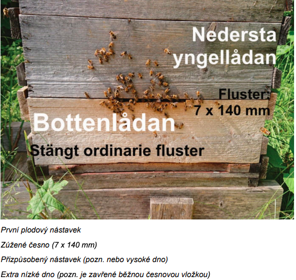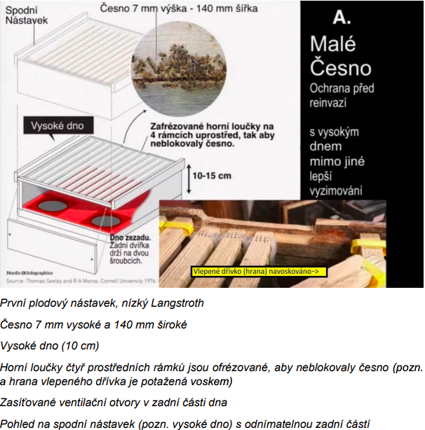 Nečetl jsem znovu celý text odkazu o Osterlundově praxi a je možné, že má autor nějaký důvod pro právě toto umístění česnové škvíry. Že je špatně = uprostřed nástavku, je zjevné, tak daleko se Švéd ještě nedostal. Také mi vadí nesmysl se čtyřmi atypickými rámky, plně by to vyřešily správnější mezerníkové (bezpleckové) rámky a pak by se daly jako protičesnové používat jakékoli rámky. Další důvod proti nelogickým pleckáčům a je jasné, proč pan Malina uvažuje právě tak, jak porezentoval - odpadla by hloupst s atypickými 4 rámky. Jenže by se zvedla včelí mezera mezi nástavky a nebo by dole přestaly rámky lícopvat s nástavkem - obojí špatně. Proto jsem to nazval nesmyslem. Na nesmyslu trvám, ale snahu věc pochopit a řešit si na panu Malinovi nesmírně cením. Bohužel je snad sám…