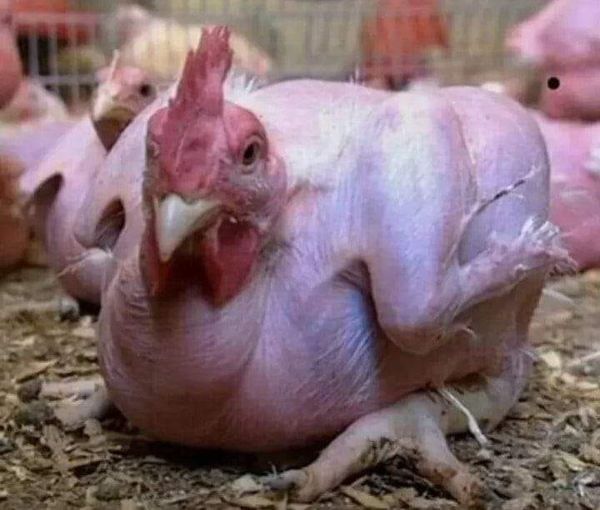 Geneticky modifikovaná kuřata. Nemohou se ani postavit na nohy, protože jednoduše neudrží váhu vlastního těla. Navíc jsou lysá - to je průmyslově výhodné, aby se vyhnula nákladům spojeným s odstraňováním peří.