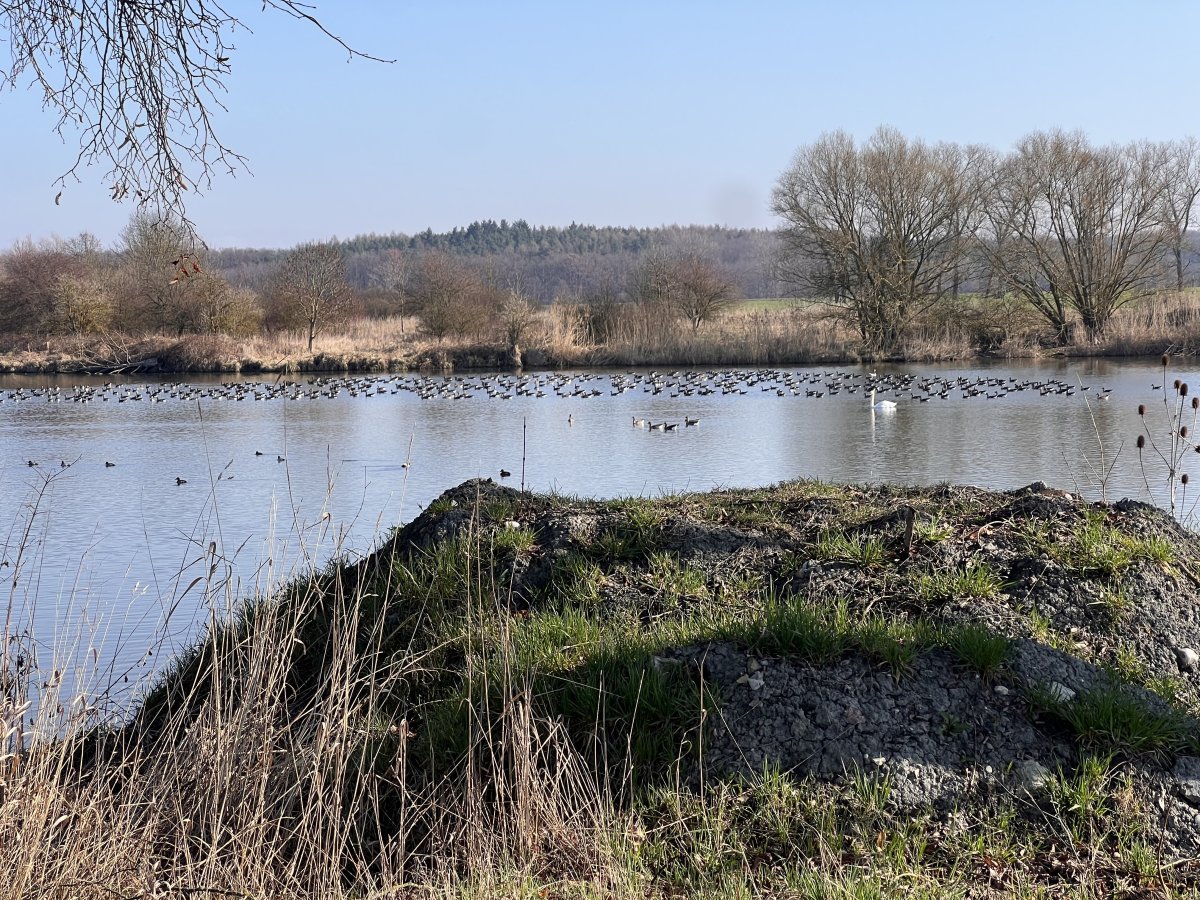 Husy přiletěly. Půlka hejna byla na vodě, půlka na louce. Slyšet byly z dálky.