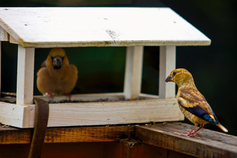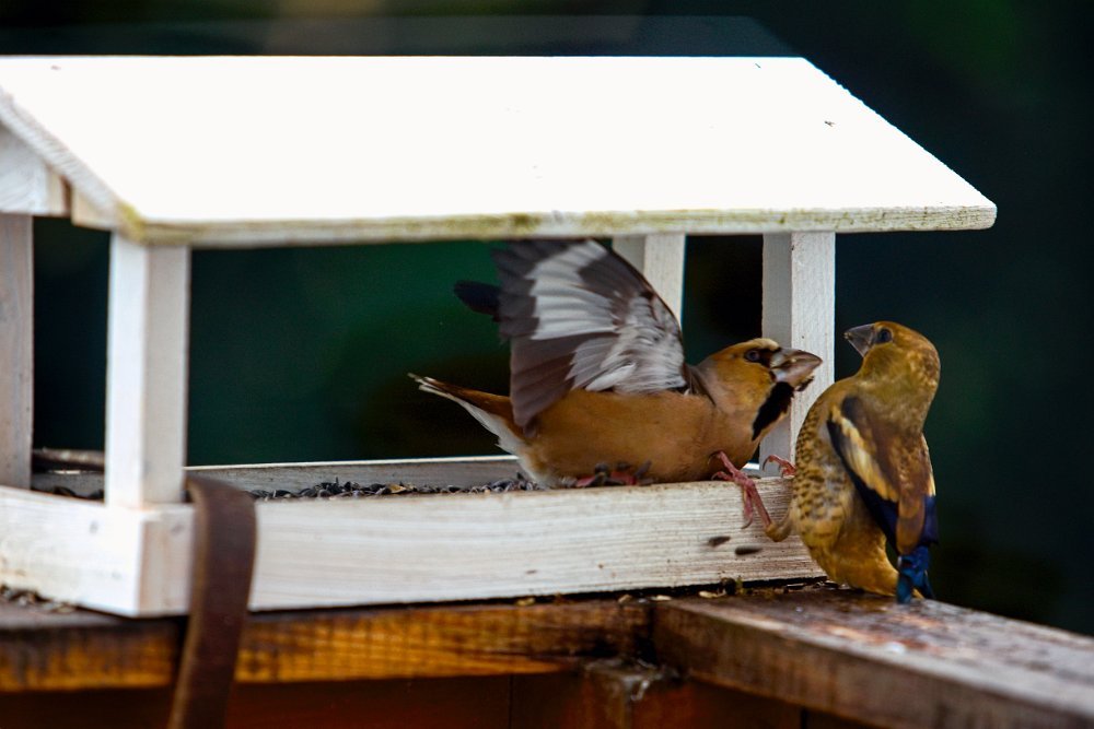 nasypala jsem slunečnici… a létají vrabci, pěnkavy, čtyři druhy sýkorek (koňadry, modřinky, uhelníčci a parukářky), létají brhlíci a strakapoudi a hlavně rodinka dlasků. A zatímco asi mamina ještě včera krmila (normálně louskala semínka a dávala je na střídačku do dvou mladých zobáků), tak dneska abnormálně načepýřený (asi naštvaný, nebo nemocný) dospělý dlask po mladých vyjížděl velmi ostře…