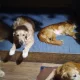 Jo a jedna rani posnidanova a poprochazkova. Na posteli z leva: kus Erisky, Drake a Saggi, dole z leva kus Prima a Otik. Je hezky videt proti Drakeovi jak je drobouckej a malickej a taky jsou hezky videt diry v modrem prehozu, coz je Otikovo prace 😀
