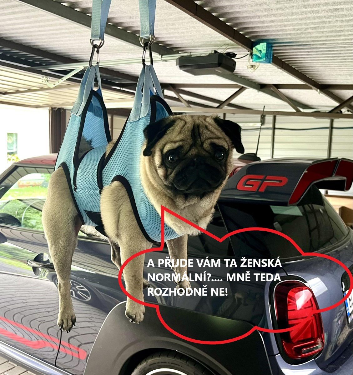 To je takový mopslí specifikum a plemenný znak: při stříhání drápů všichni vyváděj, jak kdybyste jim ty haksny řezali za živa. Chlap mi je neumí podržet, tak uvidíme, jak to půjde s tímhle.