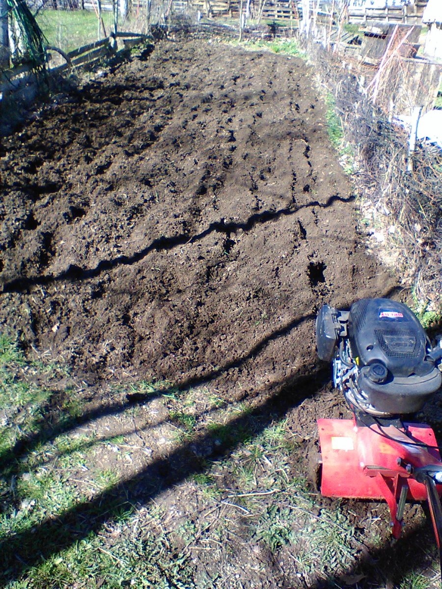 Patří ještě do března, díky bohu za rotavátor a osobního asistenta, který s ním běhal po políčku, mám brambory od pátku v zemi 🙂