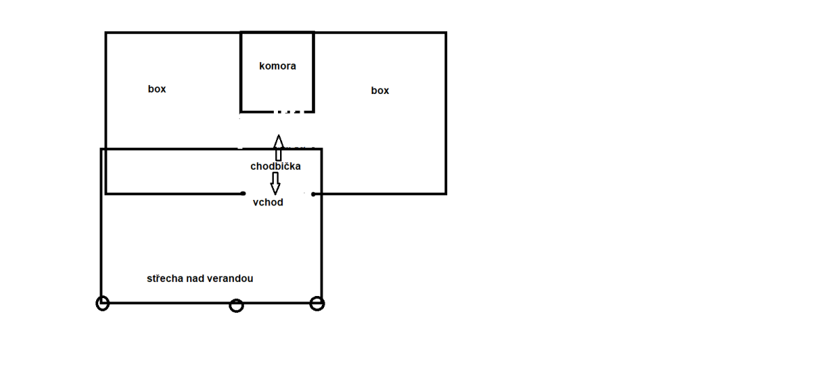 Základní přístřešek o dispozici dva boxy 3x3 m a mezi nimi ulička 1,5 m, z půlky té uličky udělaná uzavřená budka na krmení a krámy (schéma).