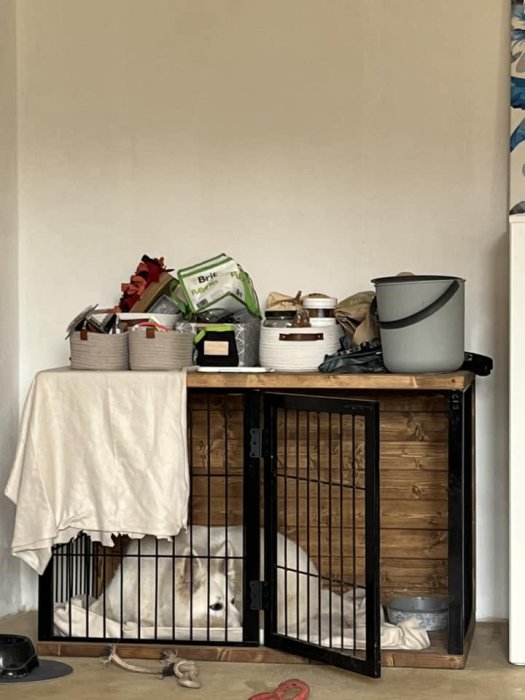 Proč a jak klec používám? Finn zvládá pobyt osamotě s obtížemi, u předchozího majitele se to naučil řešit útěkařením. Dnes po roce samotu sice nějak zvládá, už jen výjimečně dojde až na zvukové projevy nebo ničení, ale stále není úplně v pohodě. Chvíli spí na gauči, pak se přesune ke dveřím, zase chvíli spí, ale taky klidně celé hodiny kouká, rozhlíží se, je nervózní, čeká, jde čmuchat ke dveřím, jestli už konečně jdeme, atd. Pobyt v kleci jsem ho začala učit cca před rokem po mravenčích krůčkách, v intenzivním kontaktu s trenérkou.