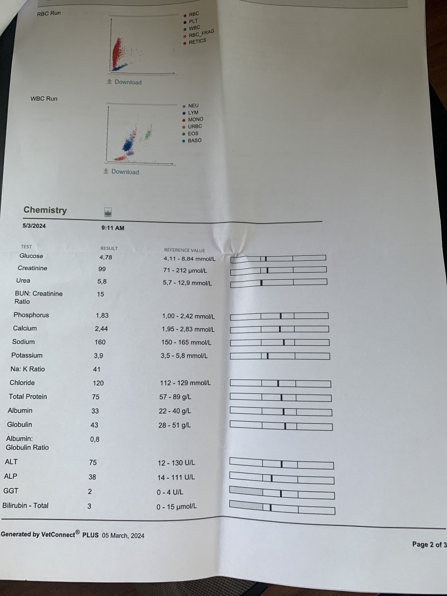 Tyto stejné výsledky krve jsme vzali na veterinu k novému veterináři, ke kterému docházíme doteď (původní veterinářka měla dovo). Tak ten zánět zřejmě usoudil dle výsledků + opravdu mluvil o uzlinách a o plynatosti.