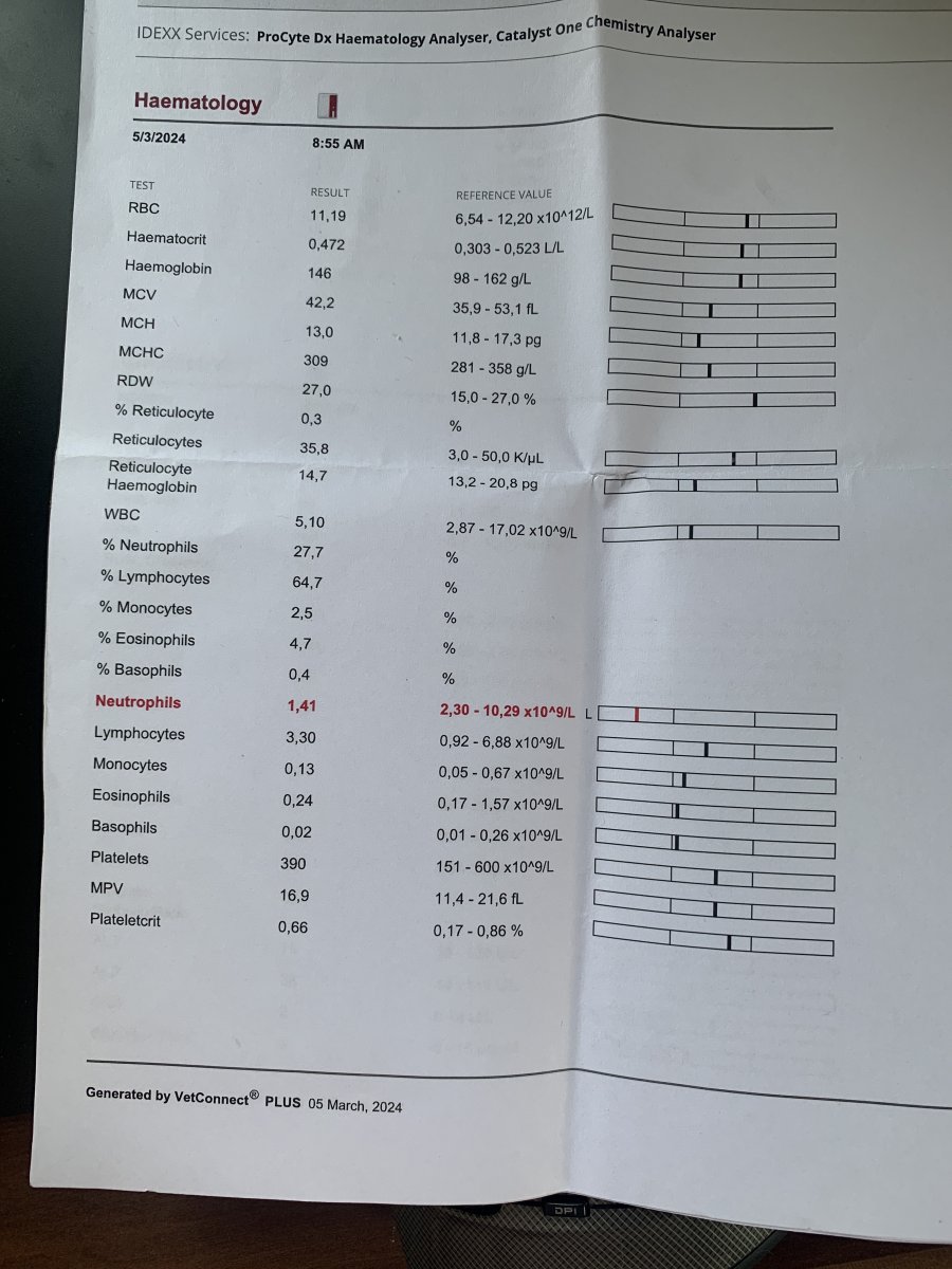 Držím v ruce výsledky krve z 5.3 kdy jsme na veterině byli poprvé - jediné, co tu není v normě je - Neutrophilis - výsledek 1,41. Pokud tomu rozumím správně, mělo by to správně být v rozmezí 2,3 -10,29…) Veterinářka nám na tyto výsledky řekla, že se o nic závažného nejedná a že to značí počínající zánět, který rozeženeme granulkama, které nedráždí žaludek a tím Famosanem. Po návštěvě byl opravdu 14 až 3 týdny klid a pak to vše začalo nanovo.