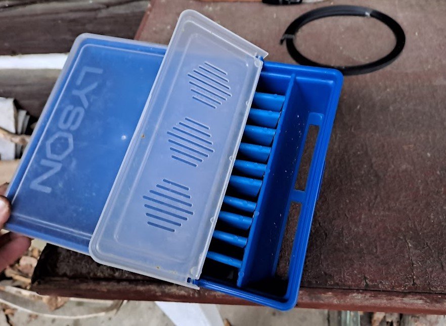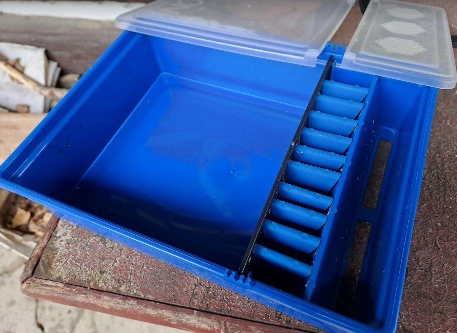 Já na krmení oddělků používám stropní krmítko od Lysoně. Má objem 2,4 l. položím ho na folii, ve které je ve správném místě pod krmítkem díra. Včely si pak prolezou do menší komory, která je propojena se zásobní komorou - spojené nádoby. Netopí se, lezou po vložené harmonice. Kolem mám jen malý nízký truhlík na výšku krmítka, vyplněný PS, ale stačil by i NN. Při nalévání se jen otevře zásobní komora - bez kontaktu se včelami. Takže můžu zaúkolovat třeba v týdnu tchána, aby večer bez obav zakrmil.
