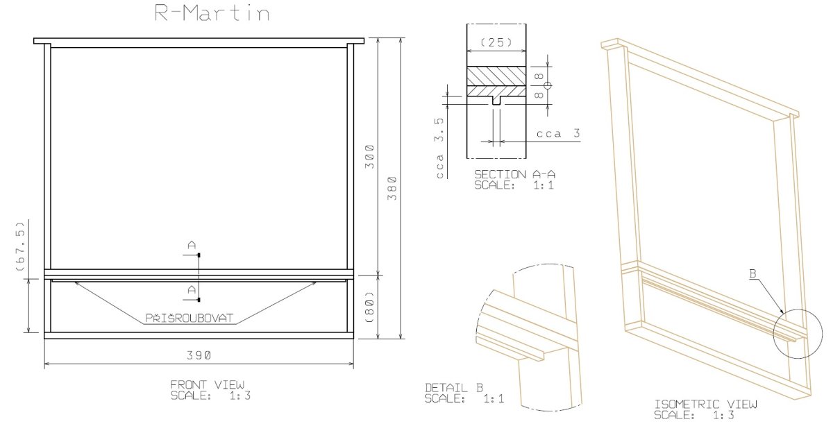 Na běžný rámek 39x30 se našroubuje dvěma vruty zespoda rámek 39x8. Sice bude mezi dělničím plodem a divočinou víc dřeva - o jednu vodorovnou loučku víc (může být jen 4-5 mm tlustá), nicméně je to, když to domyslíte, mnohem chytřejší, než co jsem vymyslel já. Jen HL tohoto závěsu bez oušek vybavíme ploutví - T-loučka, aby se měly kde chytit se stavbou. Akuvrtačku, vruty a závěsné TL-rámky může každý vozit pořád v autě! Navíc se nemusí dělat spešl rámky podle var A, ale lze podle Martina použít jakýkoliv rámek 39x30.