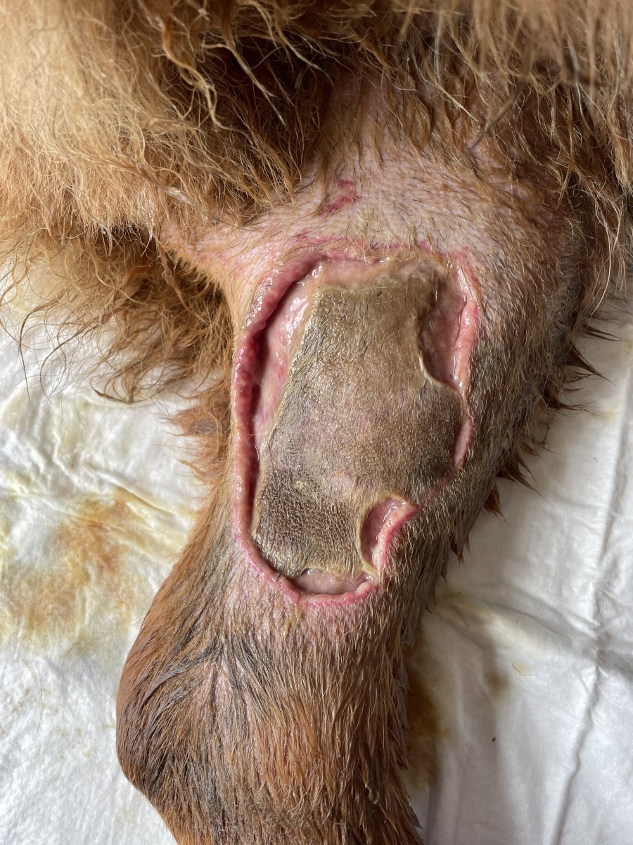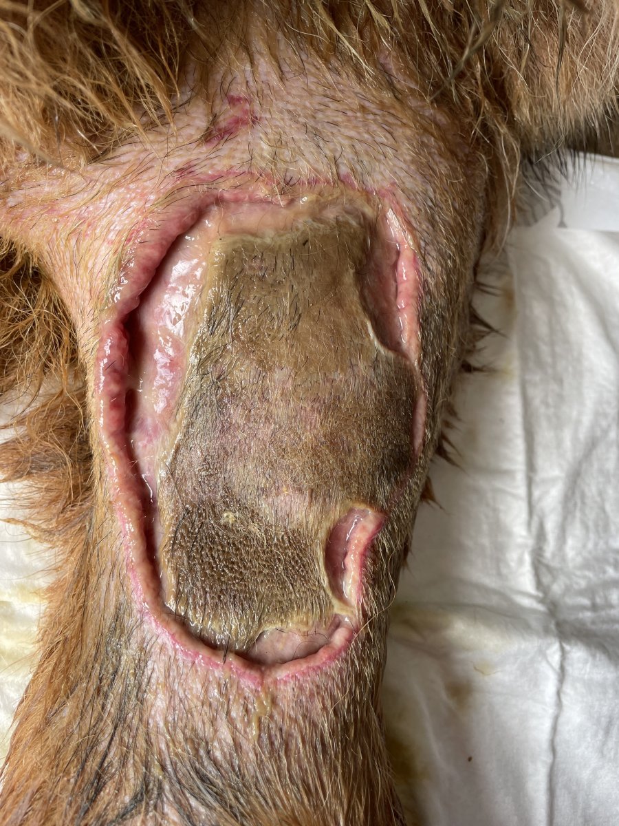 Pripade se pak vrchni nekroticka tkan sama postupne odlouci, ale pod bi uz nebude zcela otevrena rana. Obvazy na tomto miste totiz nedrzi a jak uz jsem psala vys, udrzet v tomto miste ranu cistou je proste obtizne. Kor u chlupateho a divokeho psa, ktery si obvaz bez problemu sunda jednim divokym skokem.