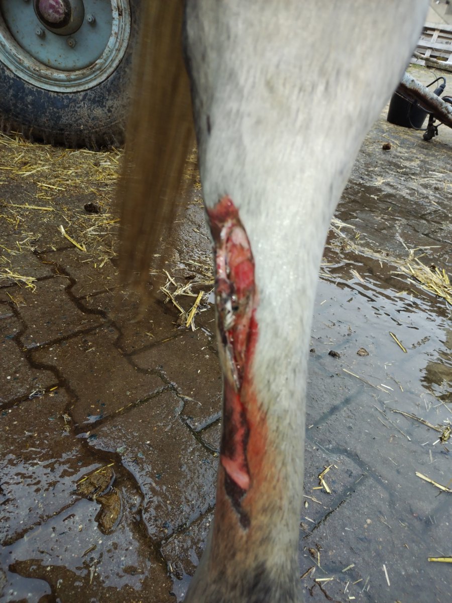 Ještě úplně původní zranění, pro představu, jaký masakr jsme hojili my: (valach si prakticky vysekl díru do nohy až na kost).