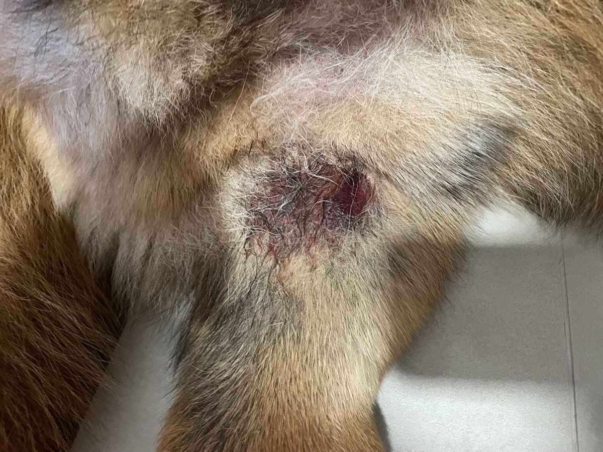 Jo, take mi neprijde, ze by mel natrzeny sval, protoze uz ani ted nereaguje na tu nohu bolestive. Jen na tu ranu. Ale tu jeste ve stredu nemel. Krvacet mu to zacalo az po prvni noci (ve ctvrtek rano) pote, co si to zvladl vylizat. Pak mu to krvacelo lehce pres den viz fotky. No a dnes rano si to zvladl vylizat do rany i pres limec. Jak uz treti noc nespim, tak jsem pak asi na hodinu a pul usla vazne tvrde a vubec me to nevzbudilo :( pak tam byla fakt vylozene vylizana rana. Ta vypada ted takhle. Ten tmavy tuplik me dost vydesil, protoze vypada jako nekroza, ale u veta ji pred dvema hodinami jeste nemel. Mozna to byla jen spina? To zjistim vecer, az mu tam budu znovu davat ethacridine lactate.