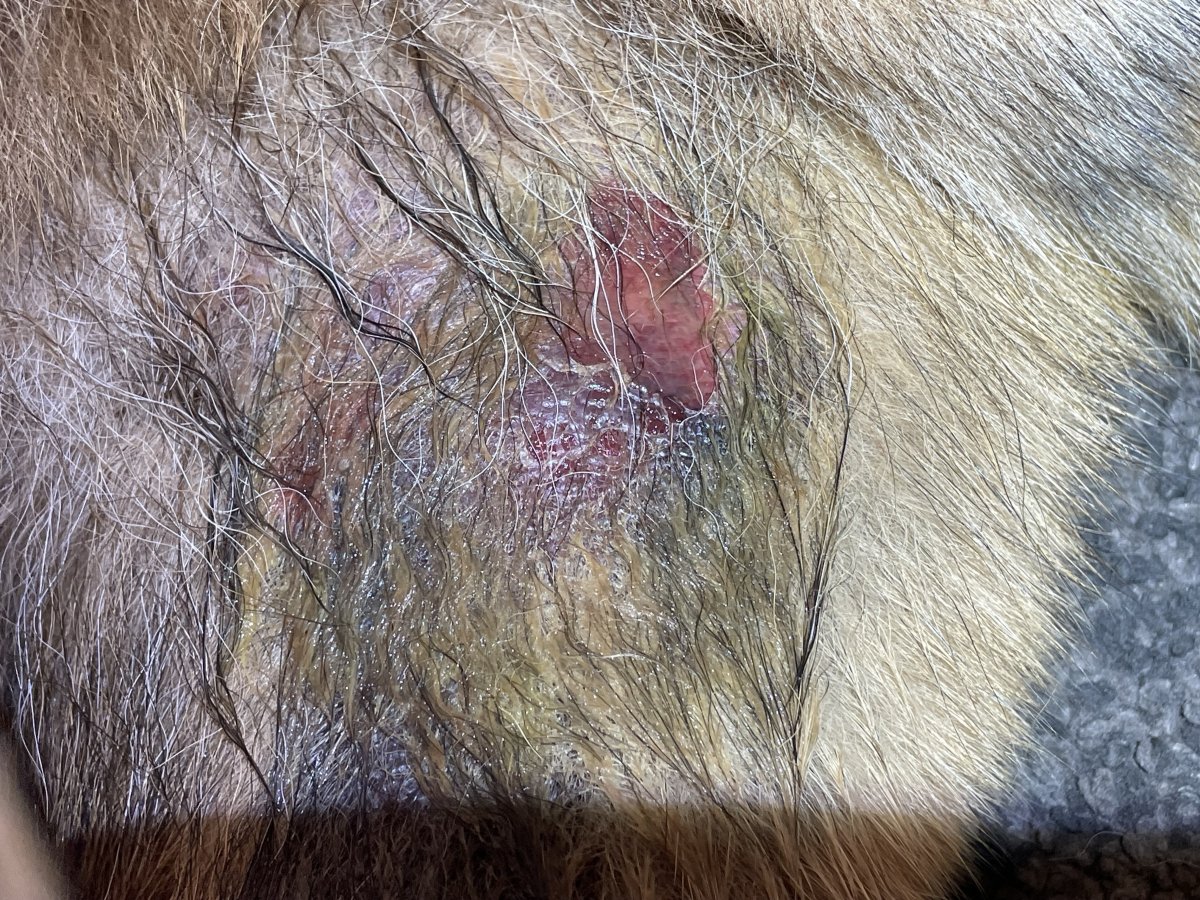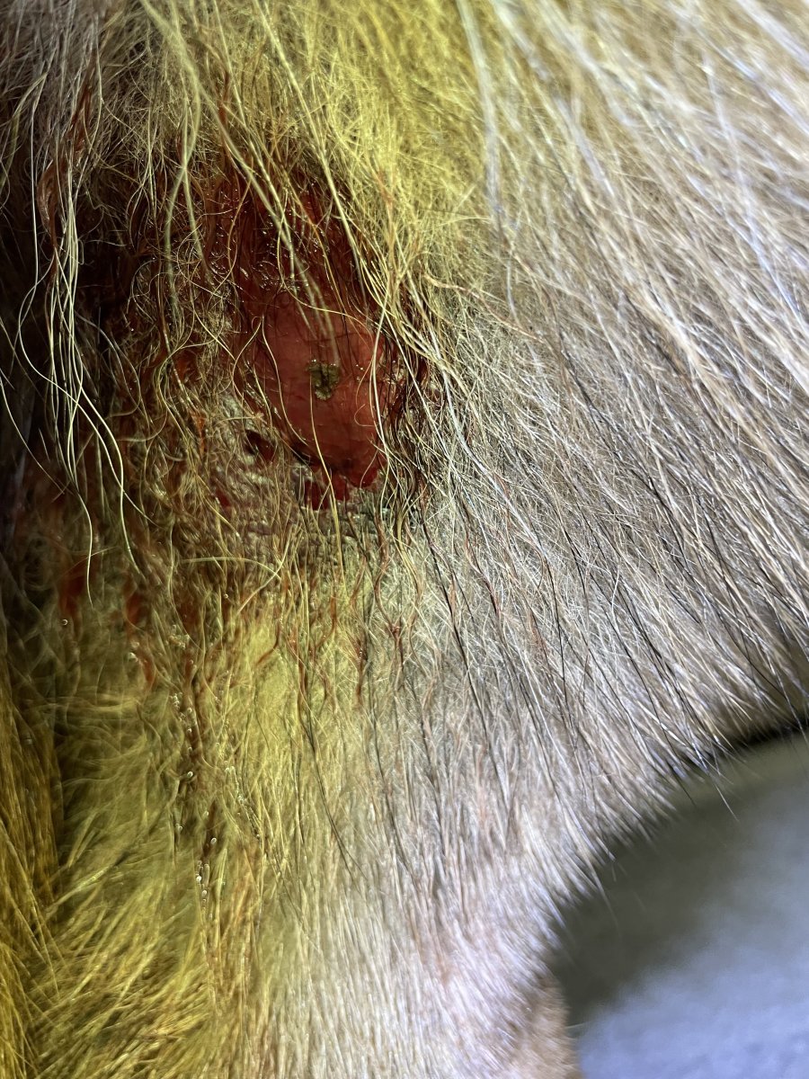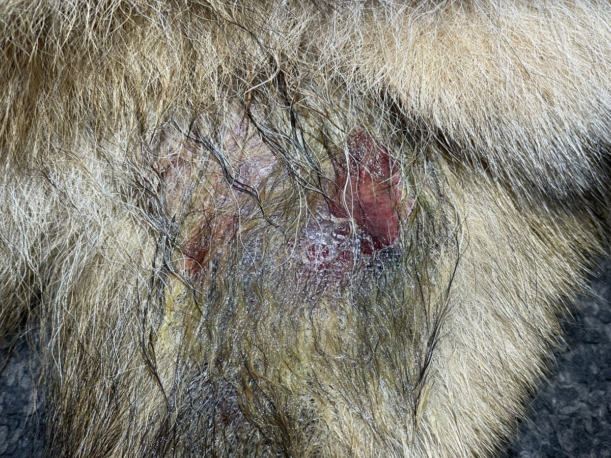 To by fakt chtělo pořádně vyholit. Takhle pořádně nevidíte co se tam stalo a bude se to pařit. Já bych taky řekla že ho kousla a nejspíš něco zanesla do rány.