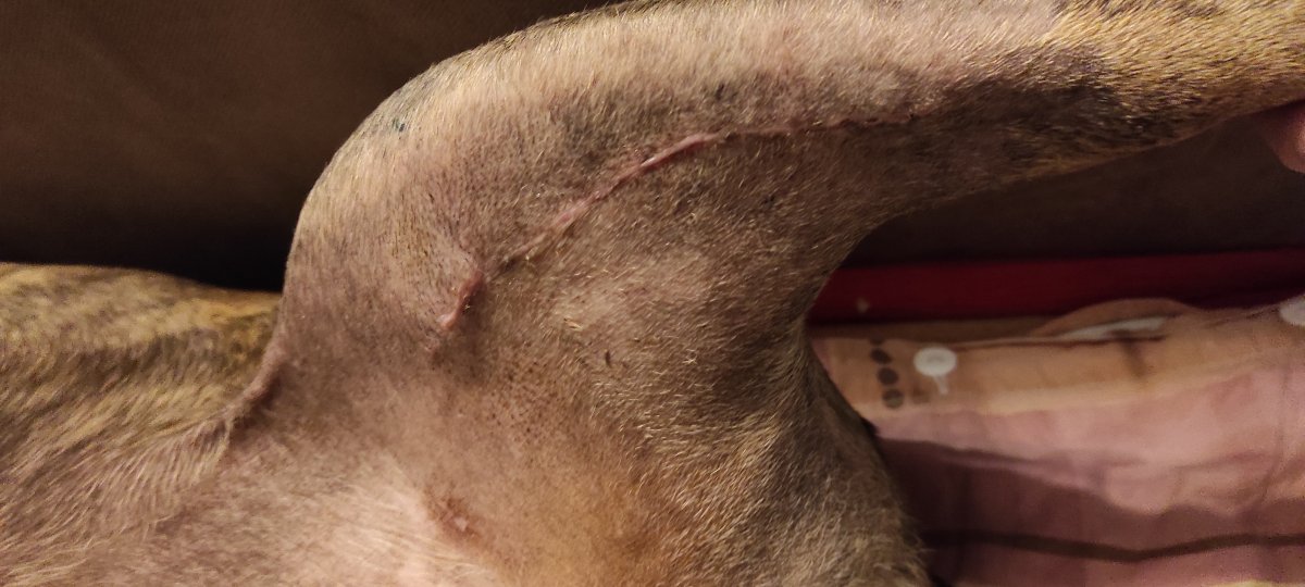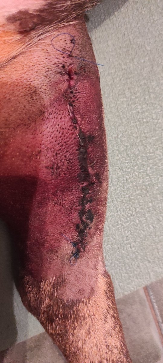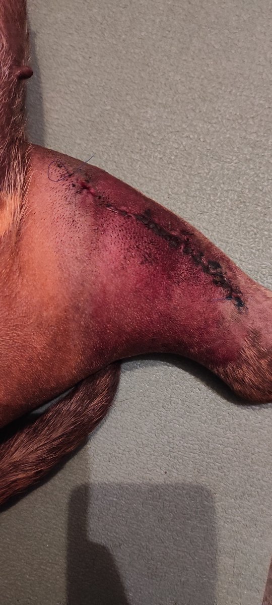 první ihned po operaci, pak jí to nateklo jako prase a zrudlo, byla jsem na vážkách jestli to není infekce, ale ATB byla pokrytá…trochu to i sekretovalo, fotila jsem to vetovi…poslední po vyndání stehů včera, je po operaci 11 den. tím chci říc, že i po velkém zásahu je otok i hematom rychle pryč. Na druhou stranu, manžel si natrhl sval a měl otok a hematom rozhodně déle.