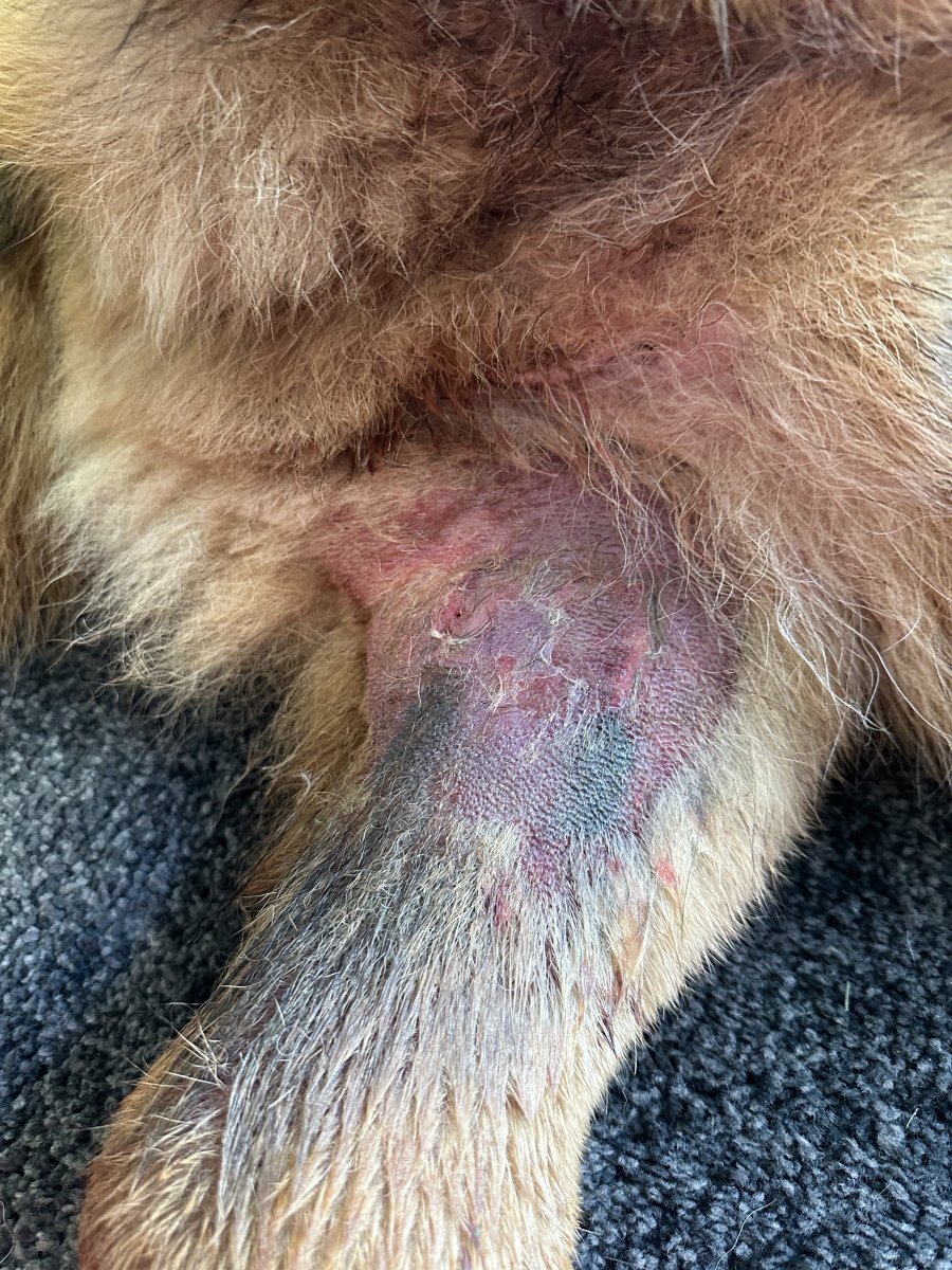 Tak ať mu to vyholí na veterině, takhle se to hojit nezačne zato se to zhorší.