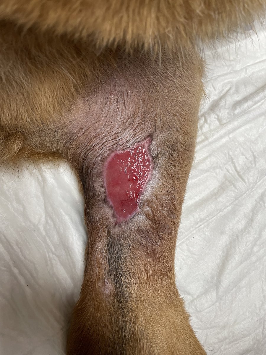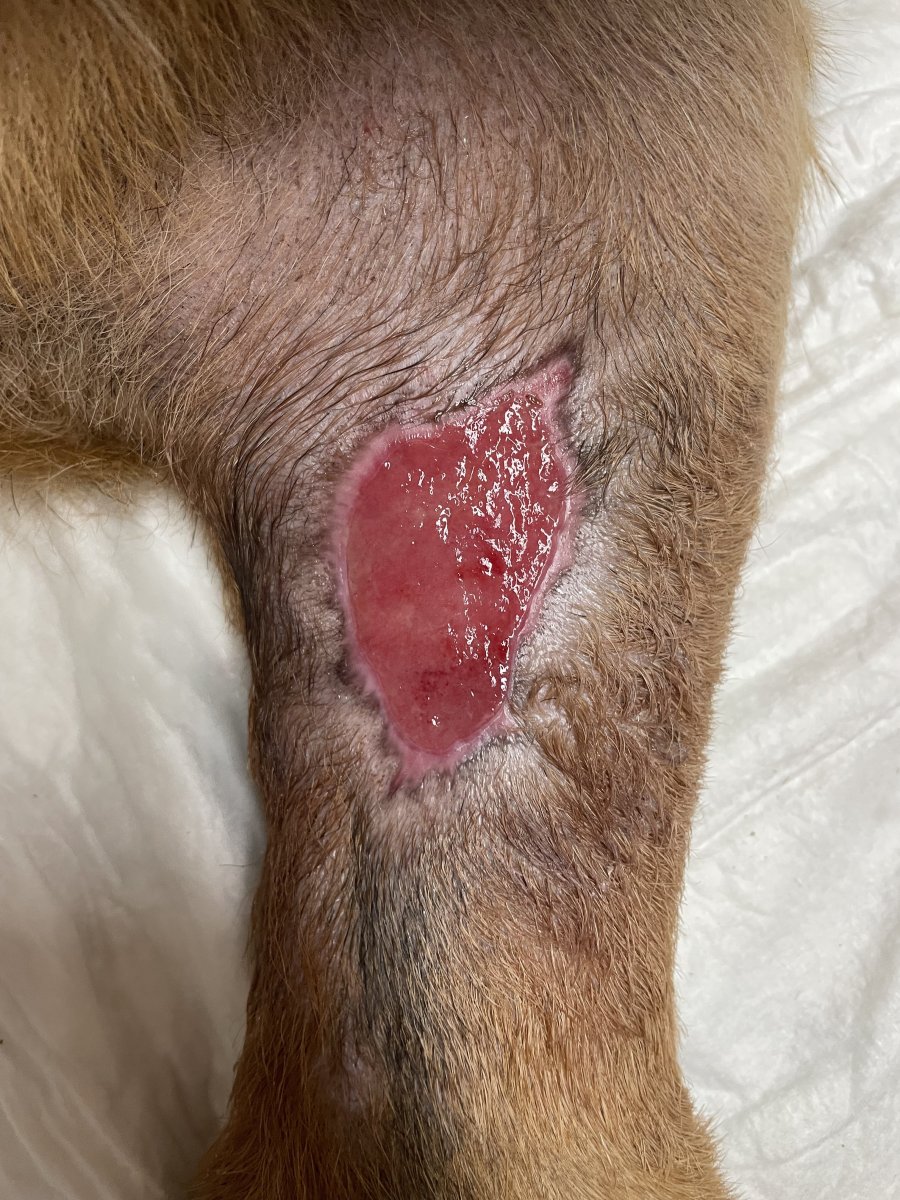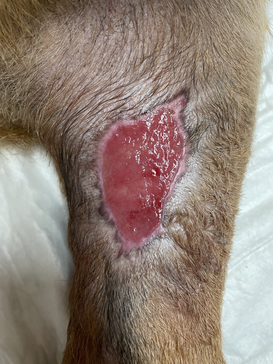 4.6. se uraz pravdepodobne stal. Tyden se pak rana otevirala, dalsi tyden se odlucovala nektoricka tkan. Otevrene to ma tedy cca 5 tydnu (od 17.6.).
