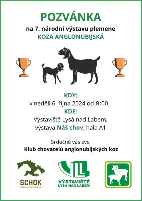 Rádi bychom pozvali všechny příznivce anglonubijských koz na sedmou národní výstavu v Lysé nad Labem. Kdo by rád vystavoval, pište do zprávy , na mail kchank@email.cz , nebo na tel: 736236721 pro zaslání přihlášky.
