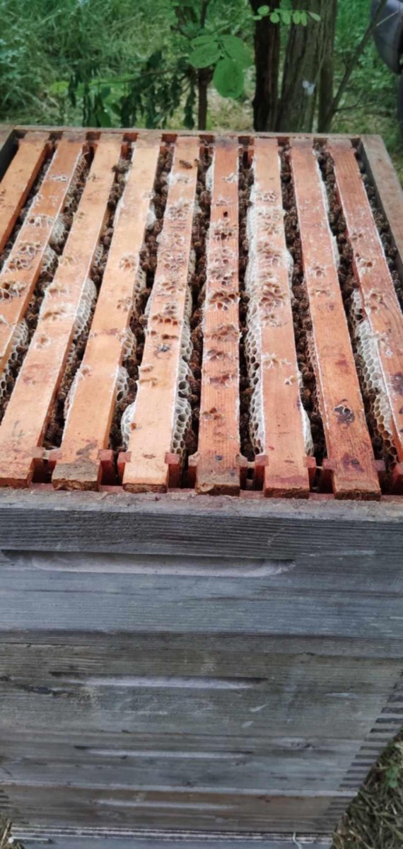 Originál “polomedník” k úlům mých rodičů 39x30 měl stejně jako originál Dadant-Blatt výšku 14,4. Protože se už většinou neví proč to tak je, vysvětlím to. Dříve, než přišel americký vliv, byla VM 6 mm. Proto 14,4 + 6 mm je 15 cm a tak dva na sobě měly dávat 30 cm, ale stejně nedávaly přesně. Prostě tady je v originálním systému hloupost. Ale to nevadí, vždy se říkalo patnáctka. Jeden rok jsem nestíhal, Petr, tehdy mladý nezkušený kluk mi chtěl pomoct a nadělal mi několik set přířezů pro N rámky. Já je sbil, vylepil a až při přidávání do včel zjistil, že jsou vyšší. Ale že jich bylo víc než původních - radikálně jsme rozšiřoval počet vč, zvětšil jsem staré medníky dole o 6 mm a od té doby mám patnáctky. Původní rámky vysoké 14,4 postupně dožily.