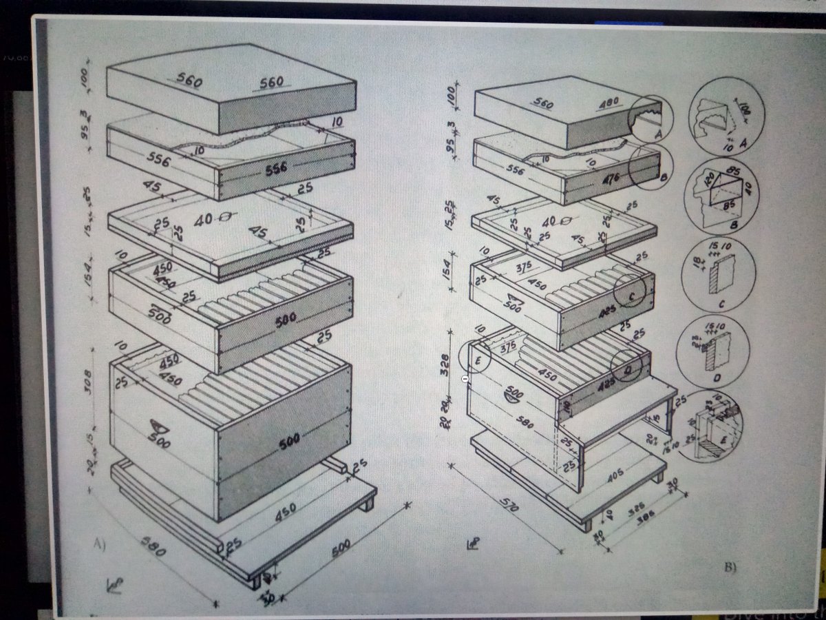 Někde tu je můj nápad na úl Hybrid. Je hotový, ale šokovalo mě, jak těžká je to bedna a to je bez rámků! Pro vaší informaci, Hybrid je D-B a když se otočí vzhůru nohama a pootočí o 90 stupňů je to Lang. Jenže Lang nezná výšku 30 a nechtělo se ji jít do atypu vysokého při délce rámku Langa 30 cm. To jsou dva důvody zastavení vývoje. Po letošní zkušenosti do toho půjdu a pokusím se - umožní to velký rámek a o hodně víc zásob ve VN, že se VN nebude nikdy zvedat, vše by se mělo vejít, tedy i TL a ještě jsem nerozhodl kde ve VH Hybrida bude, do jednoho velkého nástavku s plochou 157 dm2. Možnost Hybrida použít jako Lang zruším.