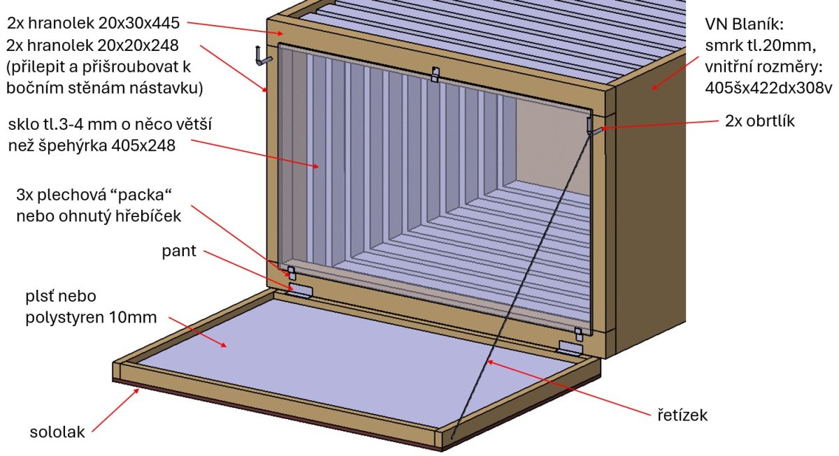 Moje nástavky byly izolované, z vnějšu hobra a uvnitř ostění z “palubek” bez per a drážek, tedy natupo, byla kombajnová sláma, celkem byla stěna 50 mm. V rozích byly sloupky a ty držely horní a dolní rám. Vnější rohy byly z plechového úhelníku z AL 1 o rameni 40 mm.