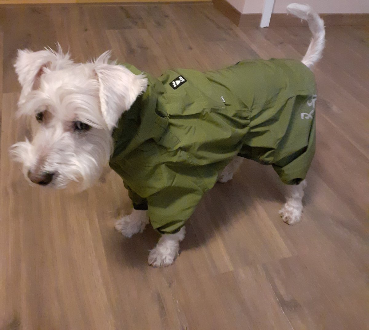 Vahine:Na zoohitu mají teď všechny velikosti a mají tam fotky v detailu a recenze. No a pokud pes nepohrdne nohavičkama…. Máme 2 a střídáme je, když se pes zmatlá. Nevýhoda- není úplně nepromokavý, ale musel by být silný déšť nebo dlooouhá procházka ve středně silném dešti, aby obleček promoknul skrz. Nohavičky jsou prodyšnější, obleček pohodlný, bělouš se v tom pohybuje dobře…viz foto z netu a bělouš hned vedle.