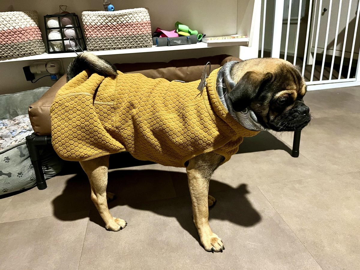 Já už třikrát sáhla vedle…. teda ne jen na Temu, my prostě troskotáme na tom hrudníku. I když uvedenýma rozměrama by jí to mělo sedět, tak jí do toho nenarvu, protože se nevejde hrudník. Minule jsem objednala Samohýla, super čuper elastickou šprcku, která by se měla natáhnout ve velikosti mini i na bernardýna. A prdlajs, nenarvu to na ní…