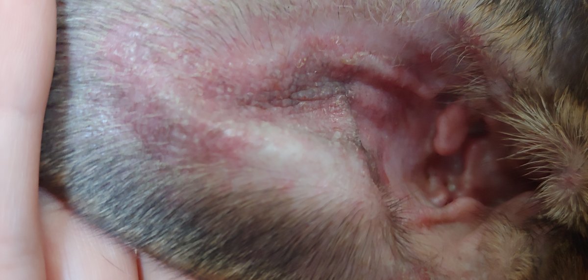 Ale zase ma neco v usich. Vnitrek ma cisty, ale v ohybech je to takove nepekne. Mazal jsem mu to par dni sirnou masti, z toho jsou asi ty supinky. Trochu ho to svedi. Alergie to nejspis nebude, z te mel zarudly spodek tela.