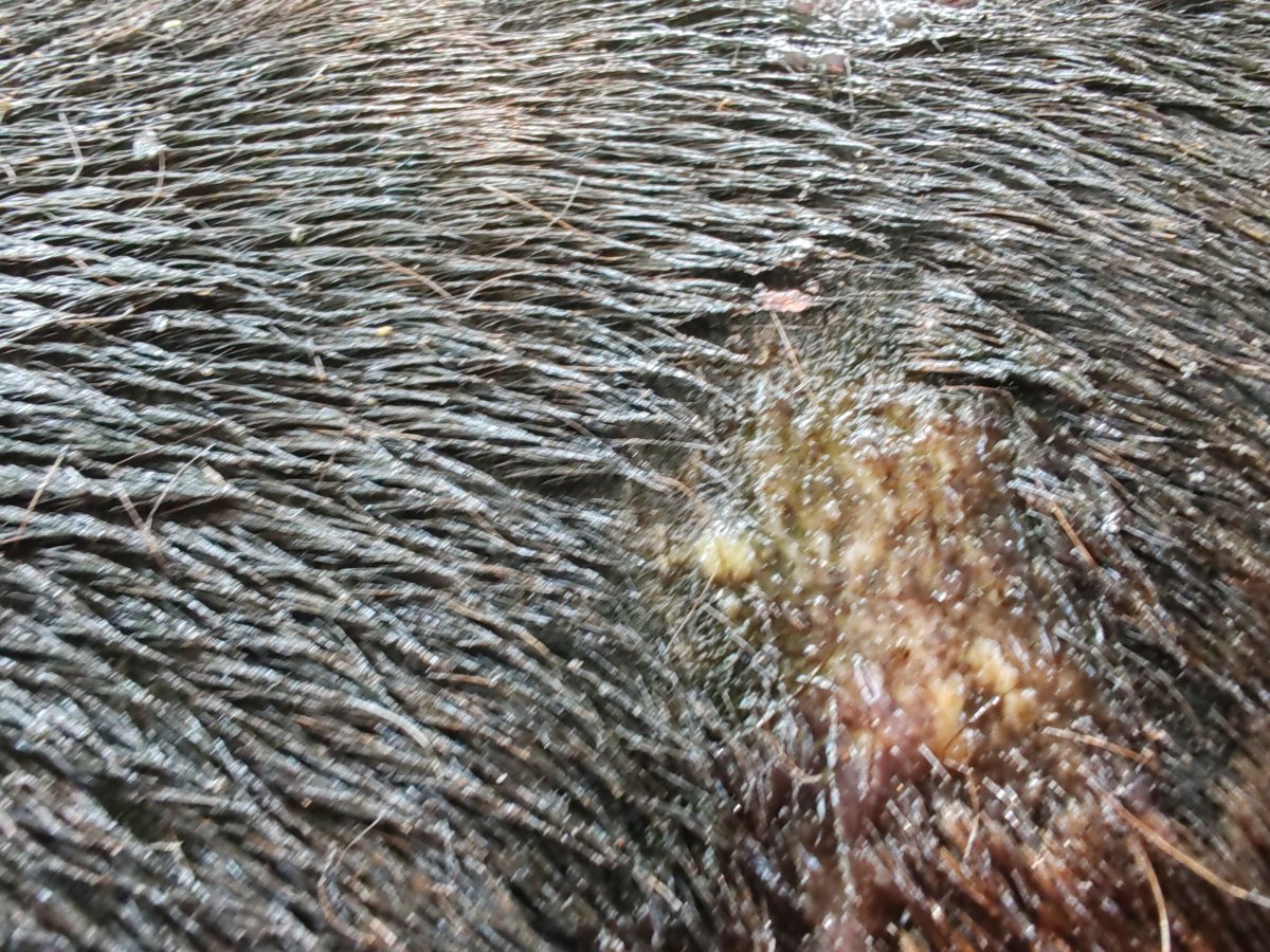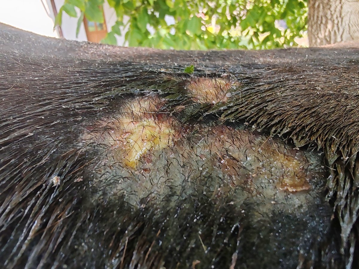 Dnes ráno odporné, hnisavé rány, kůň bez nálady, apatický, zhoršené dýchání (funí jako při námaze) a hůř drží rovnováhu. Čekám na veterinářku, uvidíme, co dál. Celý (nohy ne) vypadá oteklý a zároveň má hodně kožních řas, jaký by byl dehydrovaný. Obávám se, že bude mít nějaký horší problém, který se projevuje takhle na kůži. Určitě se bude dělat zase stěr a krev.