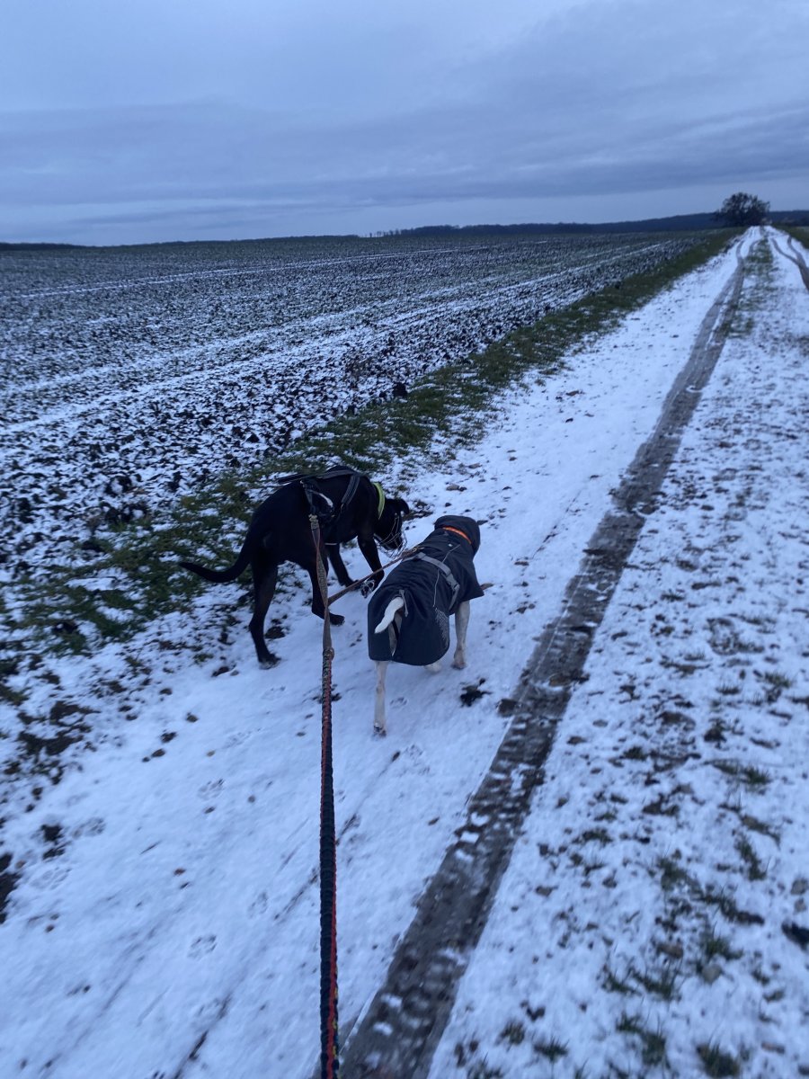 jinak když jdu se svýma psama dědinou-tj.po silnici,chodníky nemáme…☹️k rybníku,kde si pocvičíme,pohrajem,a jdem zpět,tak Dafi má svoje vodítko 1,60cm dvojkarabinový,co jsem jí šila a Žeryk jednokrabinový-obě spojený,na jednokarabinových mám na konci kroužky,at můžu k čemukoliv přepínat,připínat…