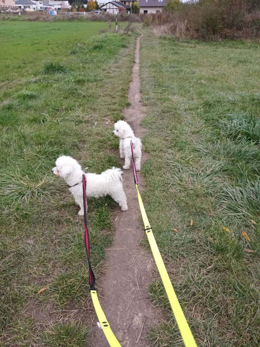 Dvojvodítko nemáme, dva a více psů jsem vždy vodila a vodím na vodítku jednom, nebo na více vodítkách spojených, aby bylo delší. Důvodem je, aby měli větší akční rádius než na dvojvodítku. Vodila jsem tak velké psy - kavkazanku se samojedem, i ve třech s fenou chodského psa, a nyní dvě feny bišonka.