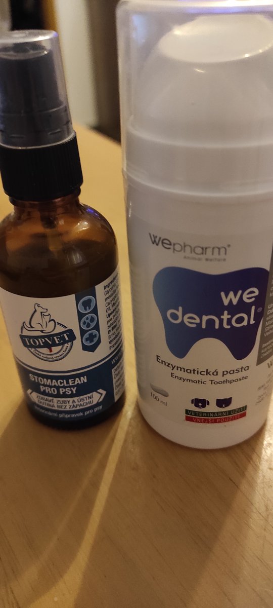 Používám Stomaclean od Topvetu a teď mi dneska přišla enzymatická pasta Wedental.Na čištění používím dětský kartáček na prst.Dobrá byla na zuby propolis. tinktura,