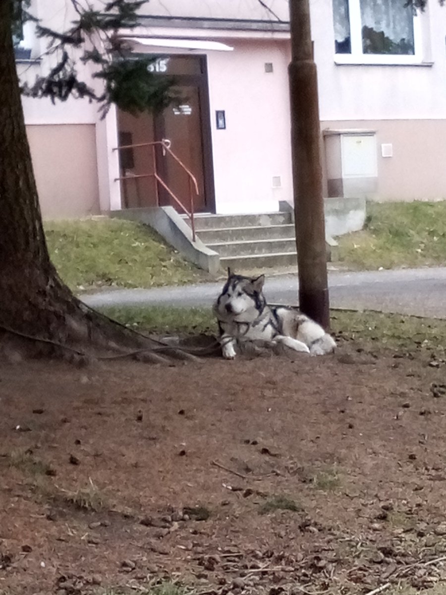 Malamut u stromu - nevím, jak je tam uvázaný dlouho, Orionka píše pracovní dobu… To nechci nijak rozporovat. Ale obecně, dřív naprosto běžná věc - šla jsem nakoupit, pes čekal na vodítku a později bez vodítka odložen tak, aby nezavazel, šla jsem si pro něco ke kamošce, pes čekal na vodítku před domem… Teď se z běžné věci dělá třetí světová.