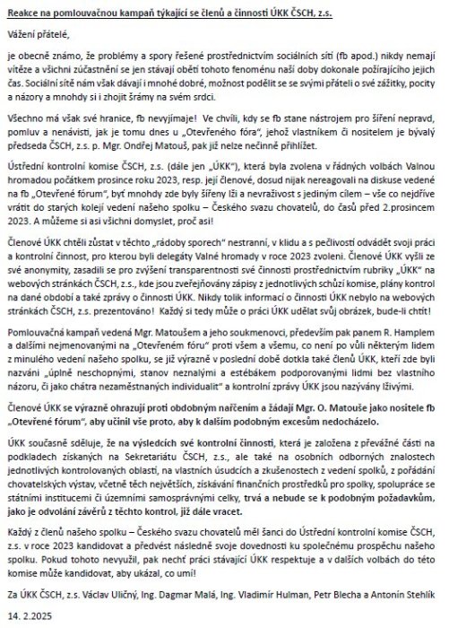 Reakce na pomlouvačnou kampaň týkající se členů ČSCH, z.s.