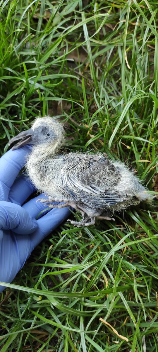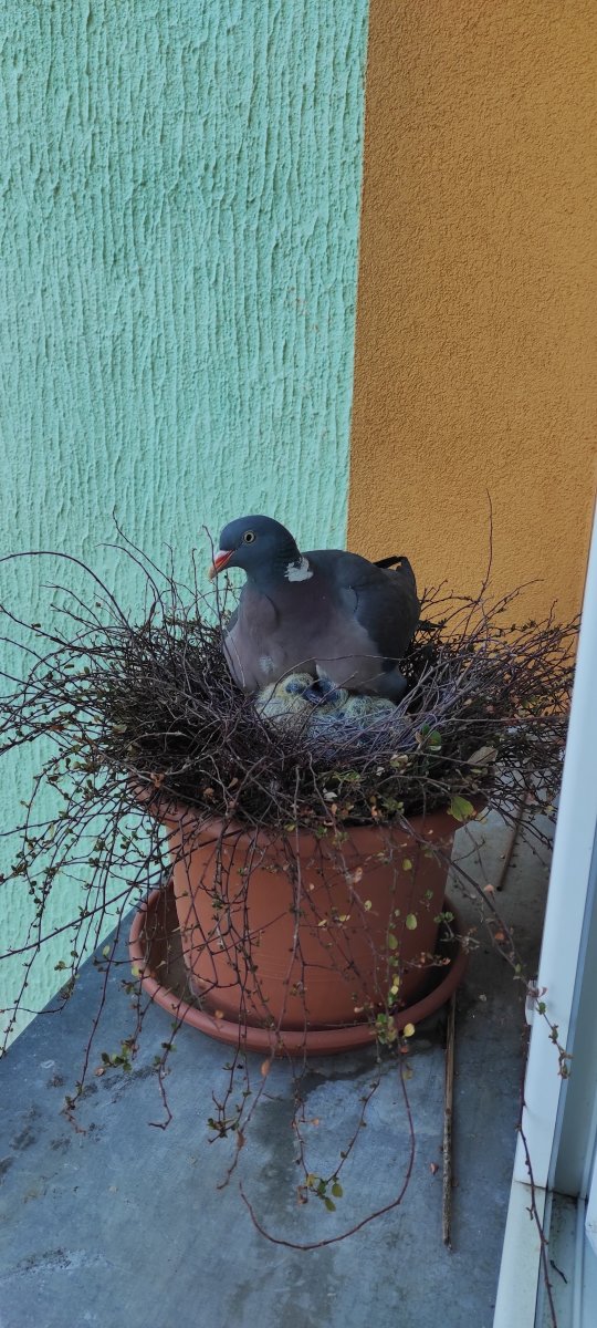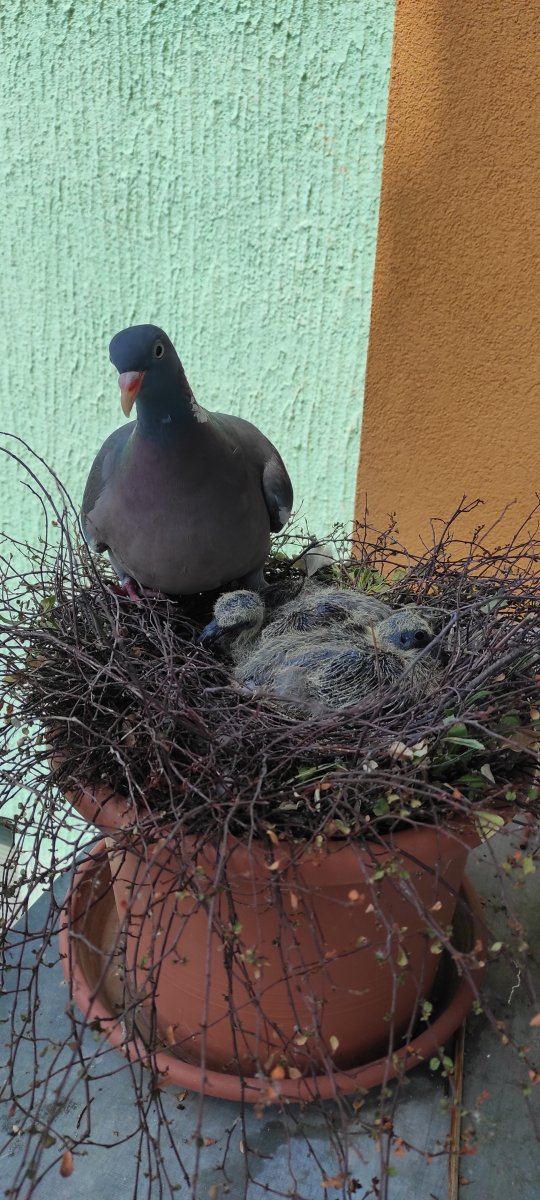 Tak a mám po koukání…dneska bylo jedno mládě mrtvé, holub opusil hnízdo a druhé vypadlo, společná fotka, asi hodinu po tom holub odletěl, šla jsem se podívat a našla mrtvé mládě, holubi už se nevrátili. …mladí po smrti, staří v čudu. Mladí najedení byli, měla plná volátka. Asi prostě ten odpolední úpal…