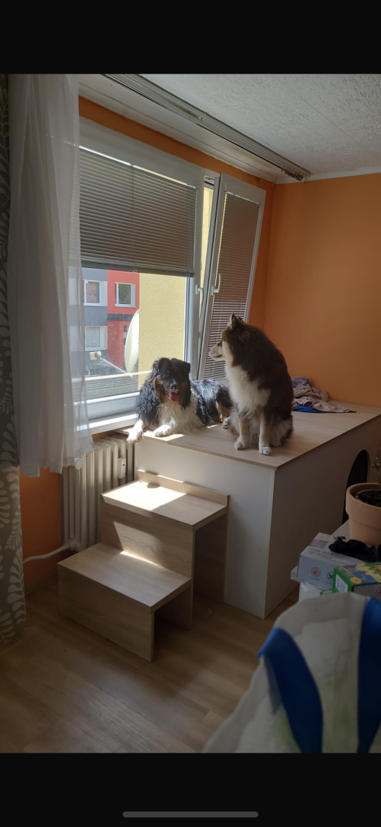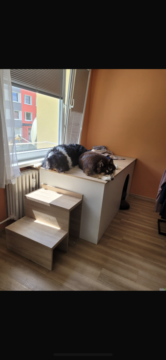 Naši mladý maj v bytě taky boudu…a rozhlednu v jednom….bouda je u okna a nahoru vedou schůdky, proto, aby psi mohli dělat Kelišky…