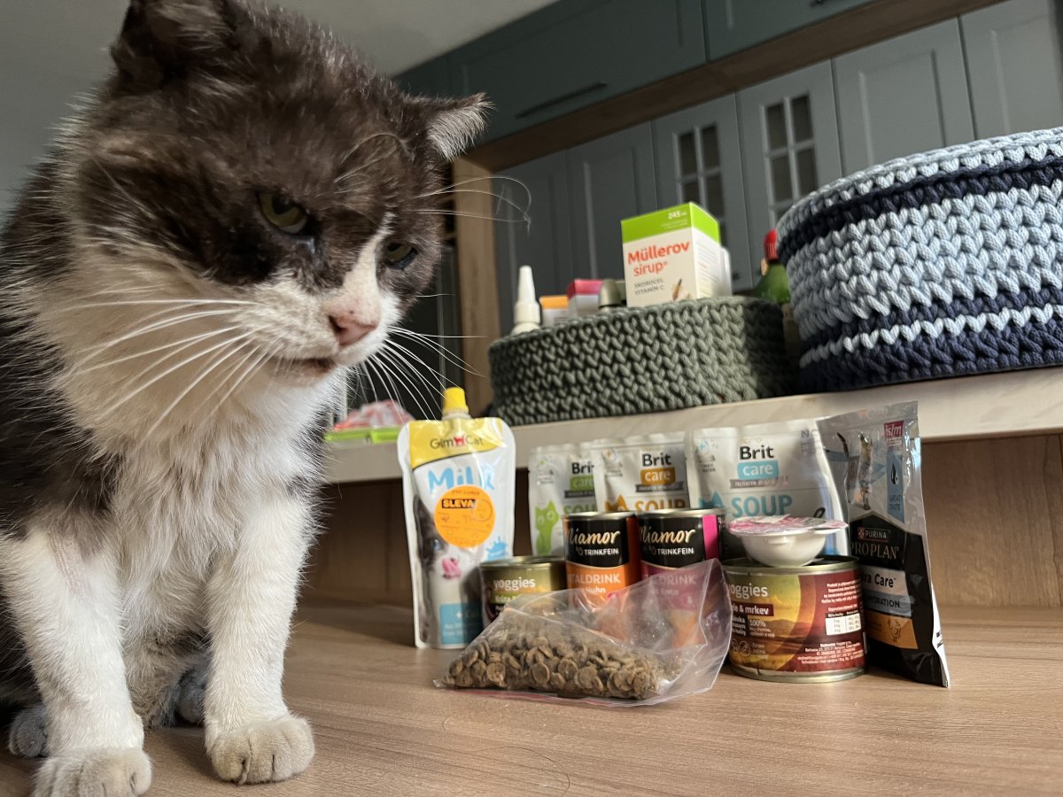 Ráno vypadal kocour dobře, pořád by žral, ale chce jen tekutý polívčičky a omáčky. Přes noc zmizelo trochu granulí. Nacpala jsem do něj prášek, ani moc neprotestoval. 👍🏻