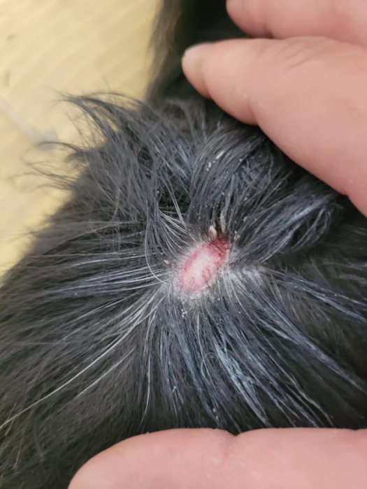 Anonymní:Naše fenka měla před 5 dny na kůži dvě malé červené čárky. Při hlazení citelné. A dnes ráno toto. Co to je a co s tím? Byl tam zaschlý žlutý hnis.