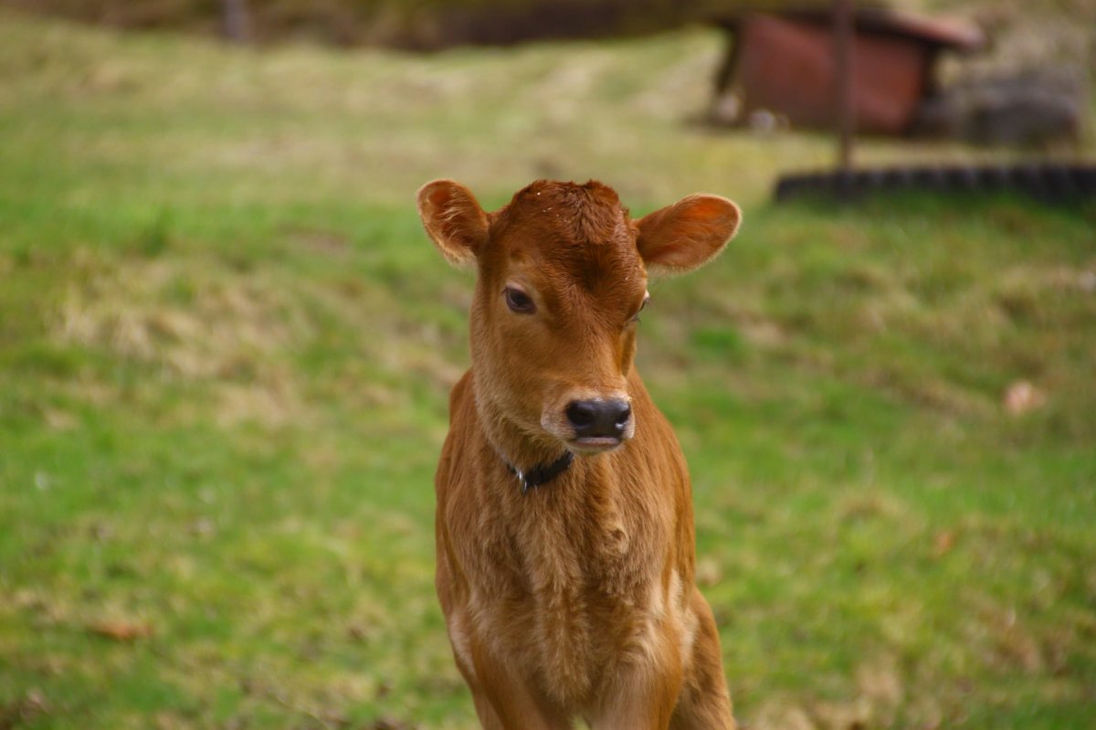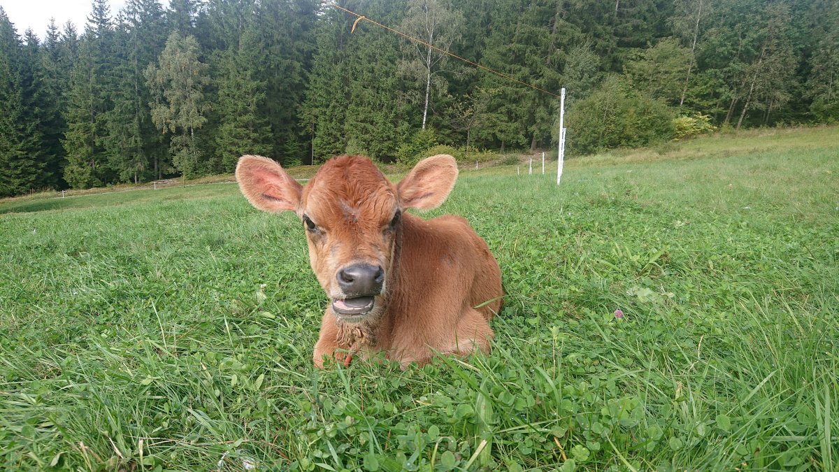 Jinak Cyril je na pastvě. Není to takové to telátko zavřené v boudičce, co papá jen to, co dostane do kyblicku.