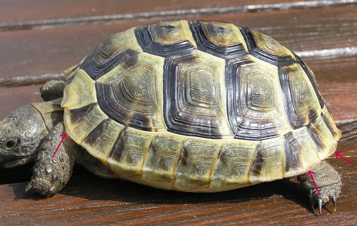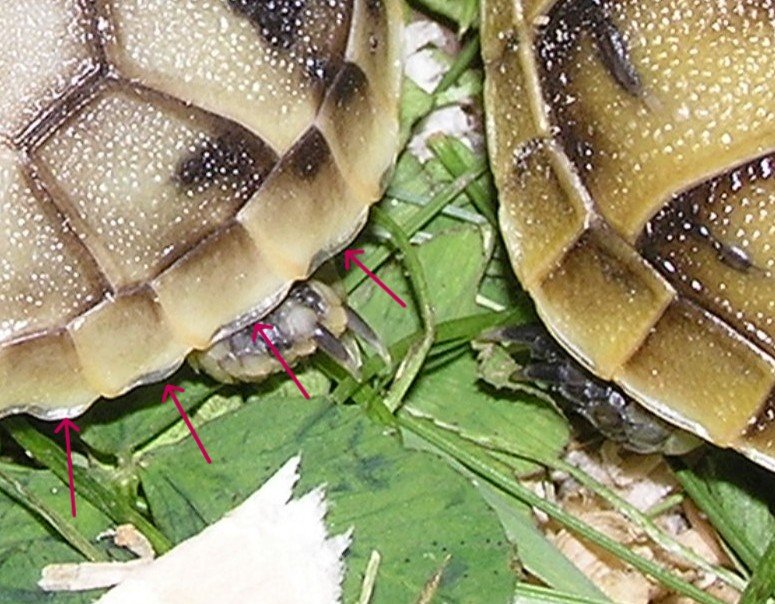 Dobrý den, pokud máte na mysli něco podobného jako je vyznačeno šipkou na přiložených fotkách, tak problém není. Jde o intenzivní ale zcela normální růst rohoviny karapaxu. Zejména u mladých jedinců a to i v prostředí venkovních výběhů to bývá patrné. Podobný efekt můžete vidět též na špičkách přerůstajících drápů, což je patrné u mláděte na první fotce. Na druhé fotce zase můžete vidět další, často poptávaný stav kdy přirůstající (přirůstá plošně odspoda z prokrvené vrstvy mezi skeletem a rohovinou) a sílící rohovina tvoří v celé ploše jednotlivých štítků, více či méně patrné, světlé drobné kroužky a “cestičky” ne nepodobné stopám po prolézajícím parazitu, to právě provokuje k dotazům. Poslední dva stavy jsem nijak neoznačil páč bychom měli přešipkováno, jsou ostatně dostatečně patrné. Jinak souhlasím se sharingan, fotka je vždy základem a mnohdy podmínkou smysluplné odpovědi.
