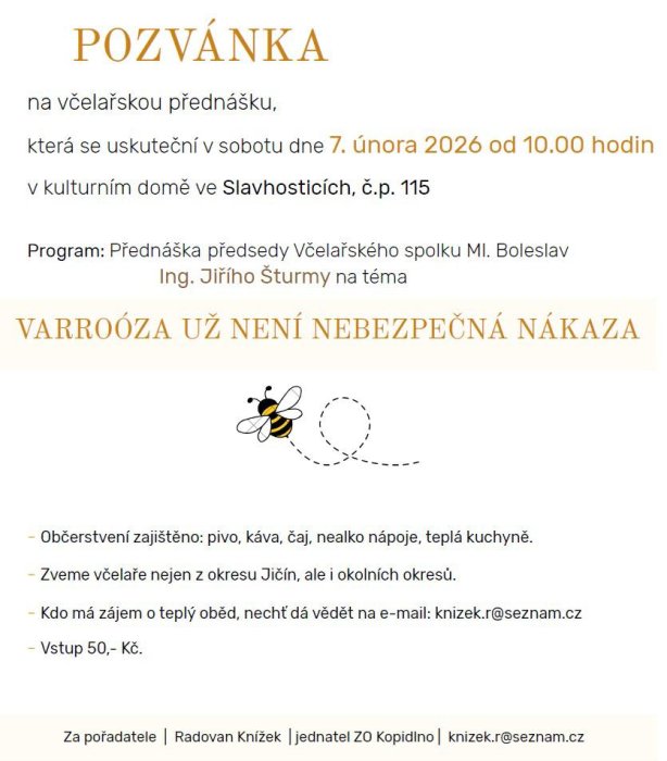 Pozvánka na včelařskou přednášku. Zveme včelaře nejen z okresu Jíčín, ale i z jiných okresů.