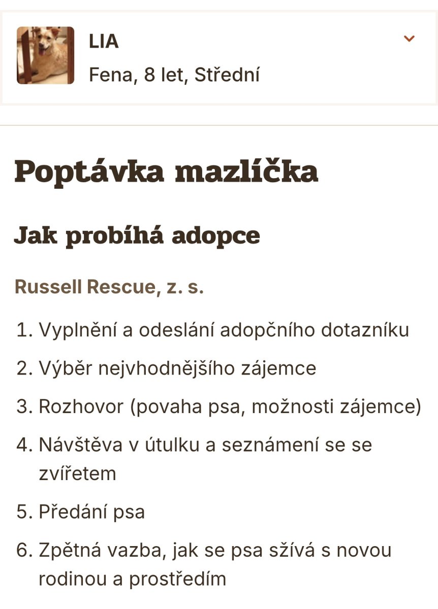 Přitom u jiných spolků vidím, že to mají nastavené individuálně podle sebe. Pro mě hrozný neštěstí a vážně uvažuju nad tím, že tam nechám jeden obecný inzerát s textem, že naše psy k adopci najdou výhradně na našich stránkách. Nebo z peswebu odejdeme úplně. Za mě je ta práce už tak dost psychicky náročná a nechat na sebe ještě ječet, že v tom máme bordel, tak to už je aj na moje pevný nervy moc…