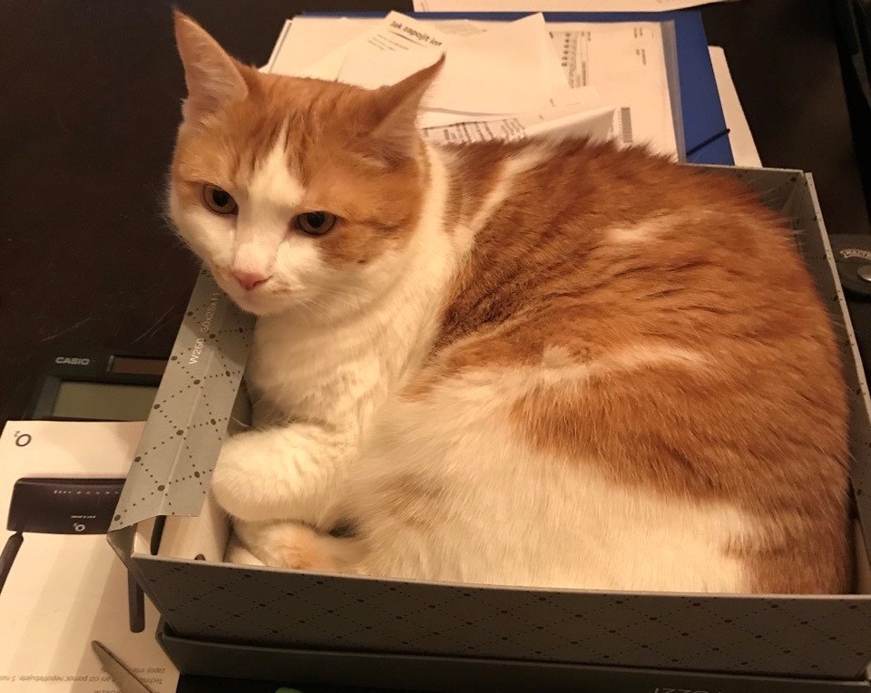 Vyžaduje sice krmení v přesný čas, ale i tak si ho rozloží například na celou noc (to večerní, ale s ranním nakládá stejně). Myslím si, že ví, co dělá a že je to rozumné. A pořád je krásnej a námi milován… A jasně, krabice od bot na mém psacím stole je nedotknutelná 😀