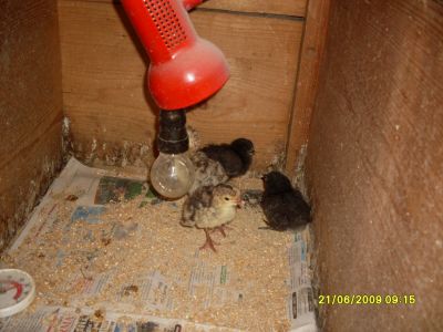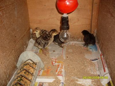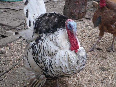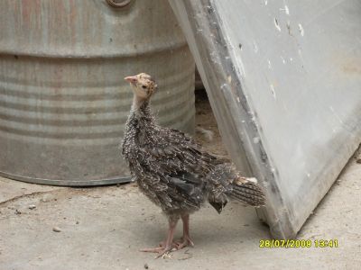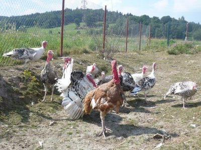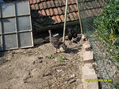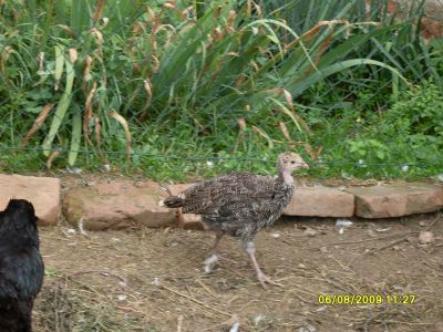 Nyní již mám krůtě na zahradě ve výběhu společně se staršími kuřaty a posledními 8 kačenami.Ze dvora sem mohout procházet i slepice.Snášejí se dost dobře. Na tomhle snímku je společně se dvěma kuřaty co společně vyrůstaly.Stále se drží dost společně.