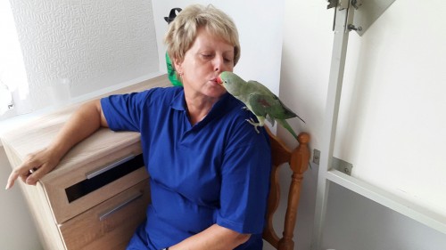 Máme papouška Alexandra Velikého. Máme ho od malinka. Museli jsme ho dokrmovat. Dnes mu bude půl roku. Je to veliký malíček. Dává samé pusinky je velice kontaktní. Necháváme ho 2x denně prolítnout cca hodinku. Když je sám už si povídá celkem srozumitelná slova.