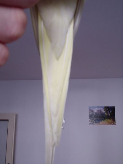 Martin (neregistrovaný)14.10.2007, 14:42:39xxx.xxx.159.243Tak tady posílám detail ocasu toho záhadného tvora. Je to po vykoupání, takže čistý. Pořád se mi nezdá, že by to byl samec, protože vůbec nezpívá, jen si sem tam vykřikne. Ale se samicí si taky nejsem jist. Četl jsem, že u této mutace se to z peří nemusí poznat vůbec.