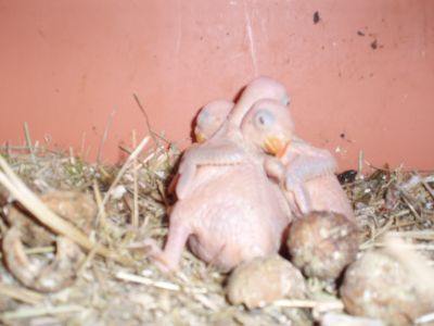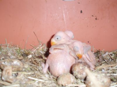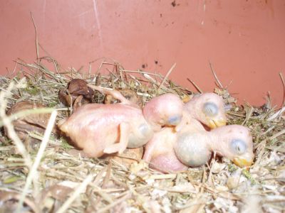 Asi za 5 dnů samice snesla první vajíčko a ob dva dny snášela další až do čtvrtého vajíčka.30.4 se mi vylíhlo první mládě a další dvě další den.Poslední vajíčko bylo prázdné.Zatím se rodiče starají perfektně.Zítra chci mladé kroužkovat:)