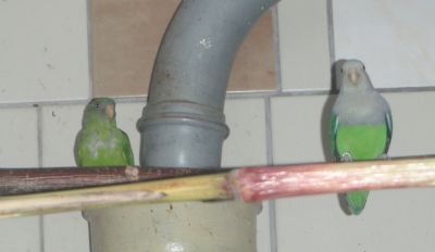 V době mé delší hospitalizace v nemocnici se mi o papoušky staral kolega, který je dle mých instrukcí přemístil do nových prostor, cany do volíérek /2 x 1 x 1,2m/ po senegalcích a pap. hnědohlavých a boudu zapomněl sundat, já je později již nechtěl rušit.